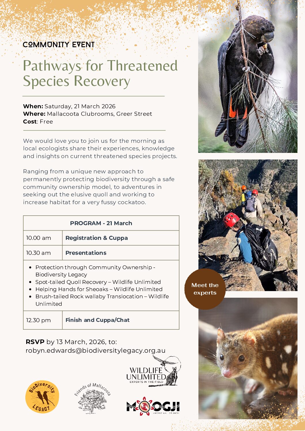 « All Events Pathways for Threatened Species Recovery at Mallacoota March 21 @ 10:00 am - 12:30 pm « Bat Chat – presentation and guided walk Add to calendar Google Calendar iCalendar Outlook 365 Outlook Live Details Date: March 21 Time: 10:00 am - 12:30 pm Event Category: Community Events Organiser Wildlife Unlimited Venue Mallacoota Clubrooms Greer Street Mallacoota, Victoria Australia + Google Map