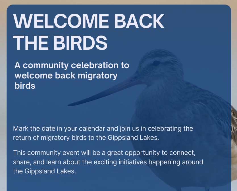 Wildlife Unlimited is excited to be part of Welcome Back the Birds – a community event hosted by the East Gippsland Management Authority to celebrate the return of migratory birds to the Gippsland Lakes.